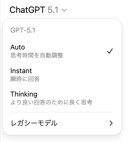 さらに、ユーザーがモデルを意識することなく利用できる「Auto」モードも用意されています。このモードでは、質問の難易度や内容に応じて、ChatGPTが自動的にInstantとThinkingを切り替えて最適な応答を生成します。