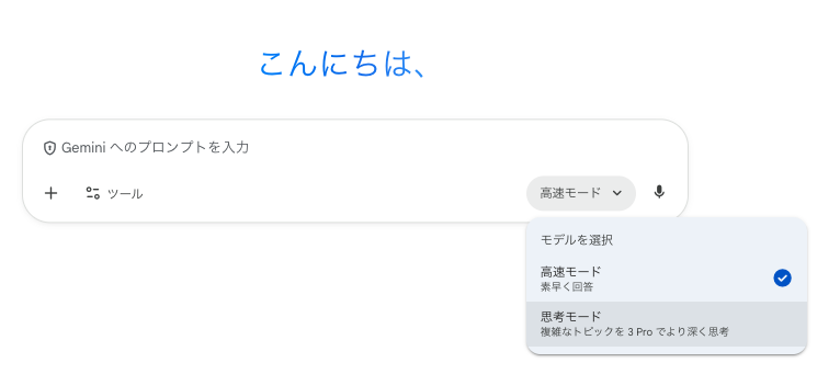 3.「思考モード」を有効化: 表示されるモデル一覧から「思考モード」または「Thinking」を選択します。これにより、Gemini 3.0の高度な推論モードが有効になります。