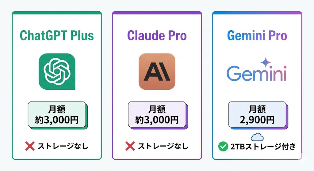 - Claude Pro:月額 約3,000円(ストレージなし)