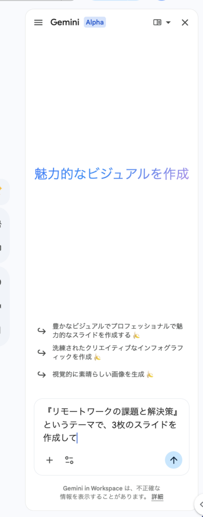 例: 「『リモートワークの課題と解決策』というテーマで、3枚のスライドを作成して」