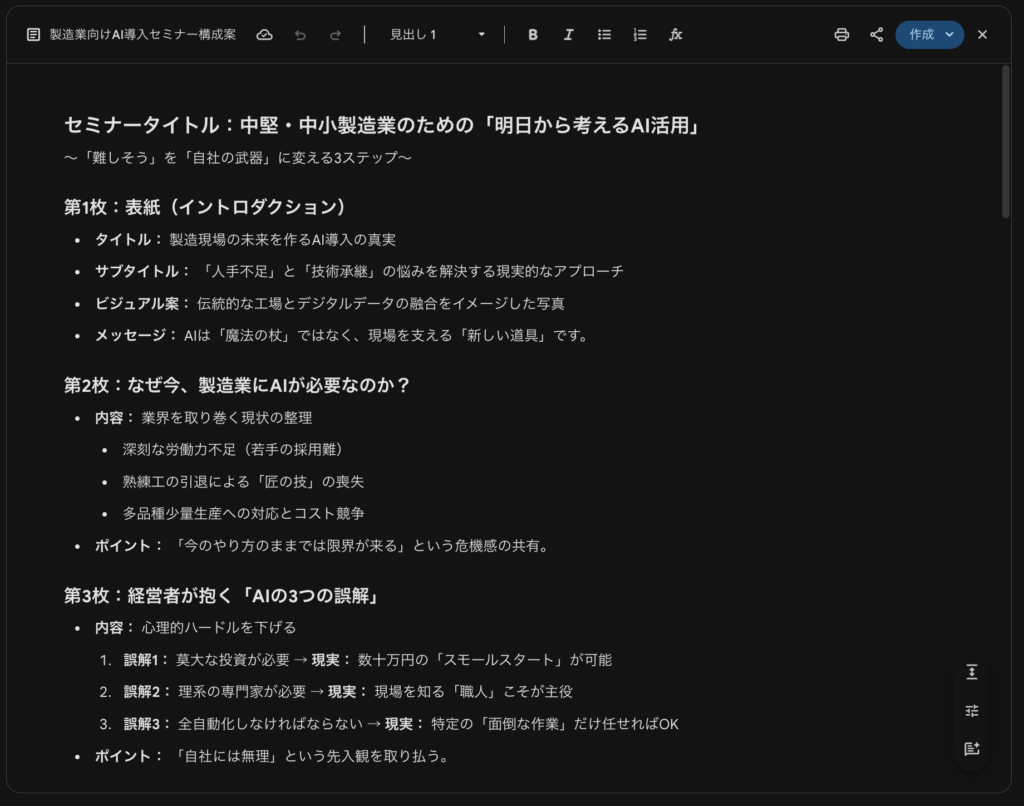 プロンプト例: 「来月、製造業の経営者向けに『AI導入のメリット』を伝えるセミナーをやります。参加者が『自社でもできそうだ』と思えるような、全10枚のスライド構成案を考えてください」