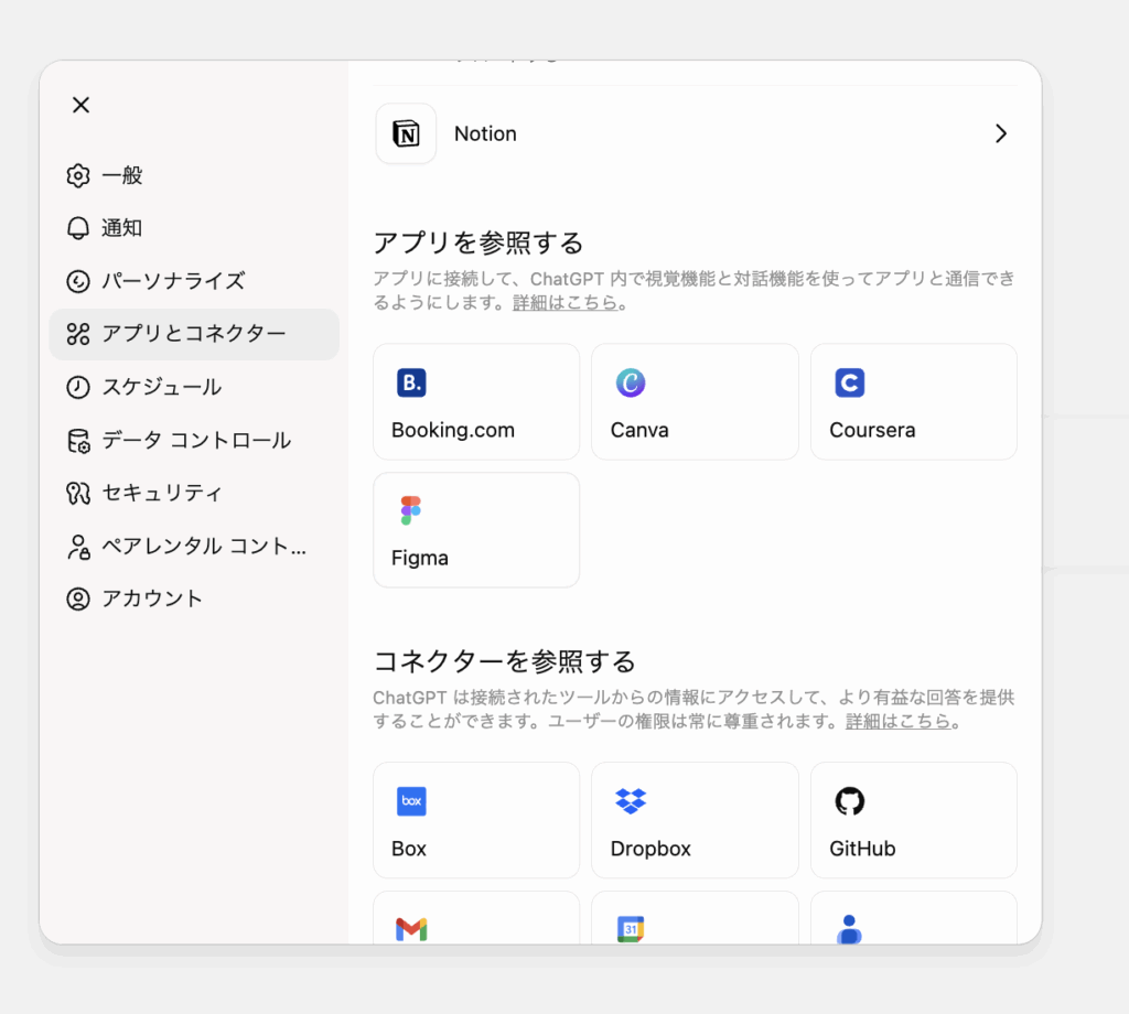 - ChatGPTに戻り、「Connected(接続済み)」と表示されていれば完了です。