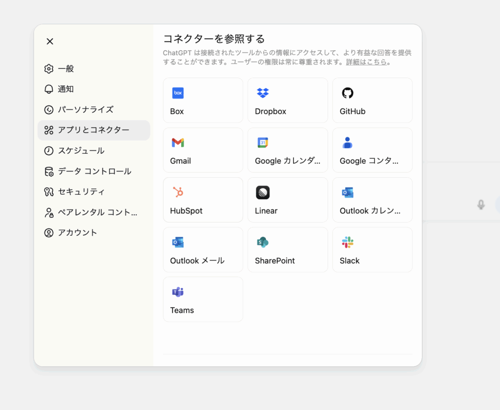 - ChatGPTにログイン → プロフィールアイコン → 「Settings(設定)」 → 「Connectors(コネクター)」を選択。