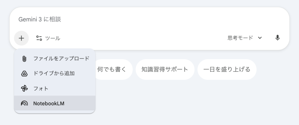 現在、GeminiのWeb版では、チャット入力欄の「+」メニューから