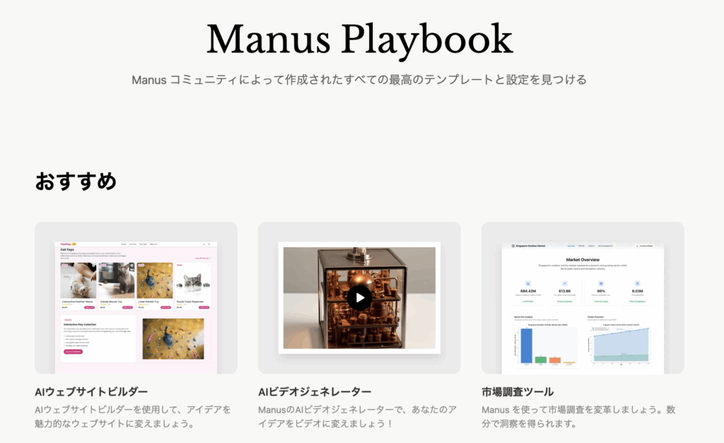 Manus公式コミュニティや開発チームが提供するテンプレートやプレイブックを使えば、定型業務の自動化がすぐに実現できます。