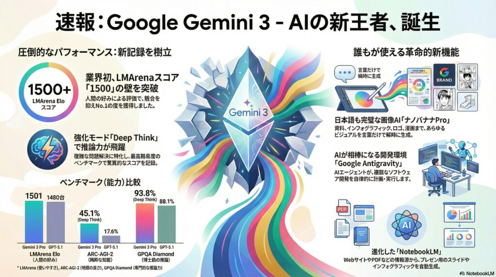 Nano Banana Pro(正式名称:Gemini 3 Pro Image)は、2025年11月20日、Google DeepMind によって発表された、最新の画像生成・編集モデル。以前の “Nano Banana”(Gemini 2.5 Flash Image)の上位版として、単なる「絵を描くAI」から、「意味あるビジュアルをつくるAI」へと進化を遂げたモデルだ。