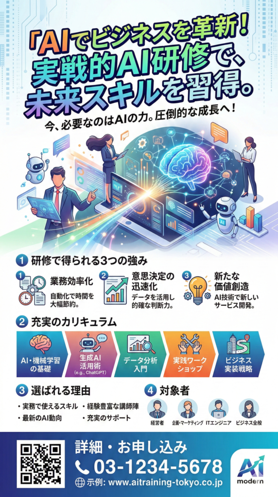 これから紹介する生成画像はどちらも「AI研修をおすすめするチラシの画像をA4サイズで作って」と指示して生成してもらったものです。